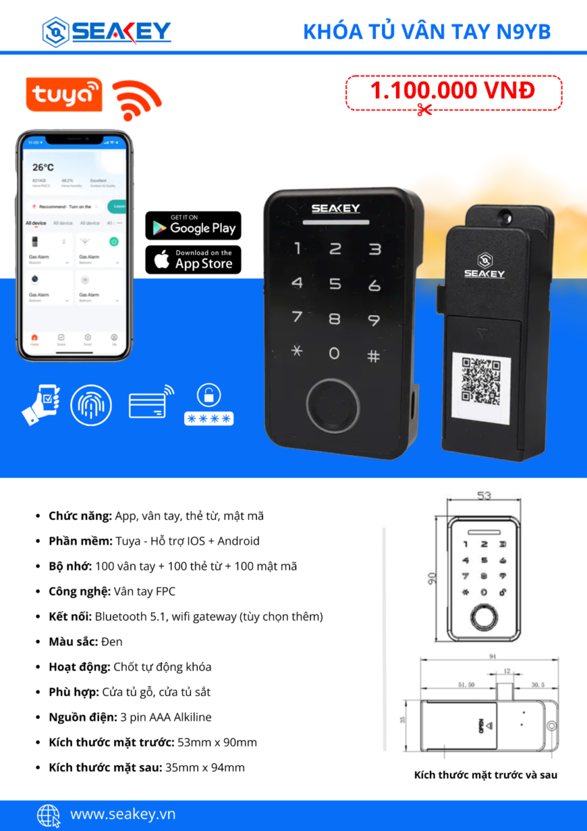 • 4 cách mở khóa: App điện thoại, vân tay, mật mã, thẻ từ