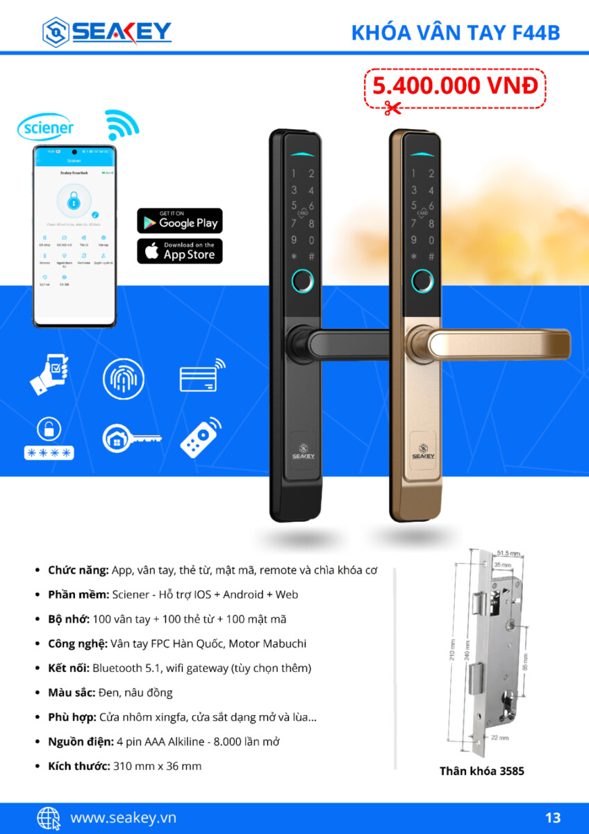 - Công nghệ: Vân tay FPC Hàn Quốc; Moto Mabuchi Nhật