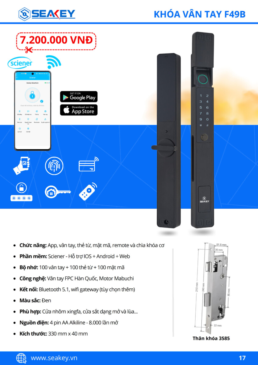 - Công nghệ: Vân tay FPC Hàn Quốc; Moto Mabuchi Nhật