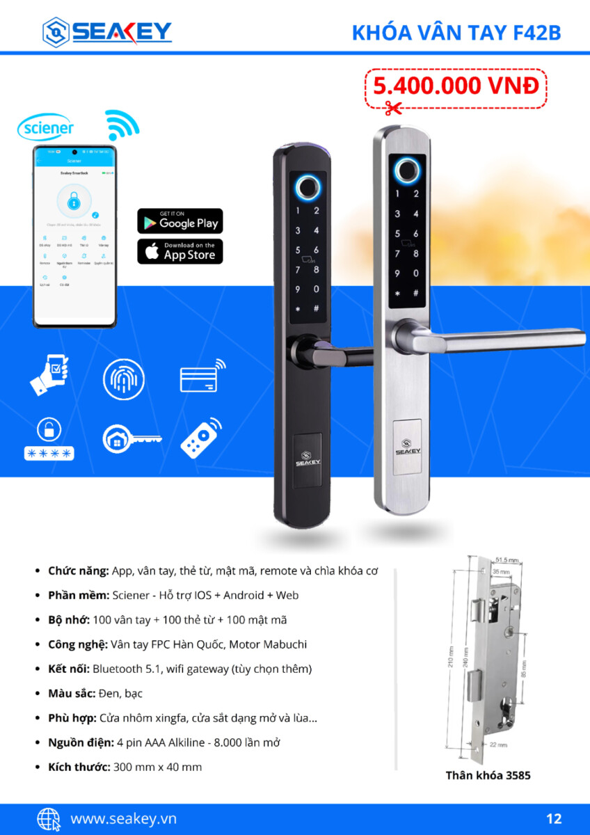 • 6 cách mở khóa: App điện thoại , vân tay, mật mã, thẻ từ, chìa khóa cơ chống sao chép và remote (tùy chọn mua thêm)